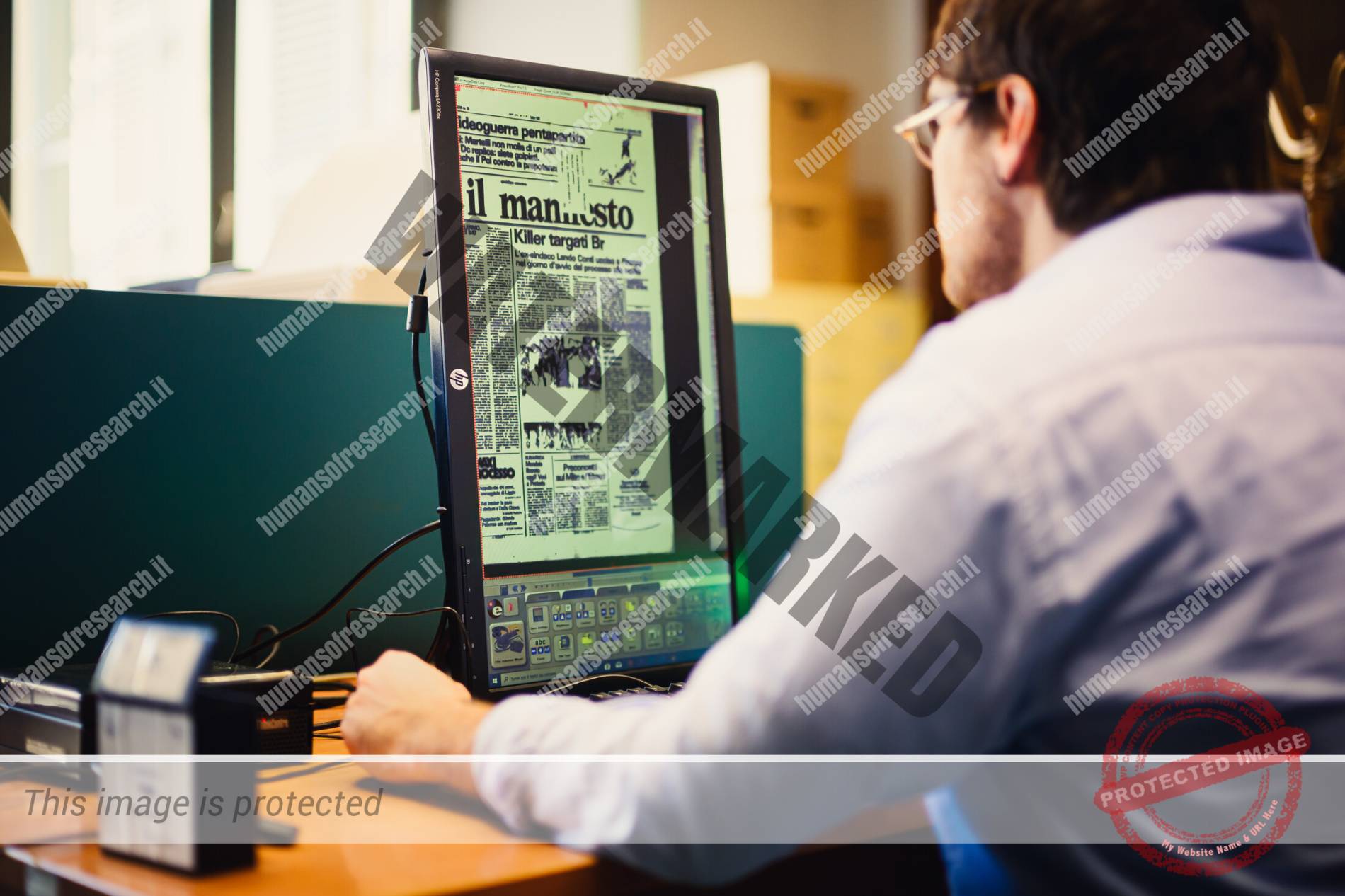 Lo guardiamo mentre si siede davanti al lettore di microfilm. Inserisce con attenzione la bobina, abbassa il vetro, fa scorrere lentamente la pellicola con una manopola. Le immagini appaiono sullo schermo come fantasmi: pagine antiche, titoli, fotografie sgranate.